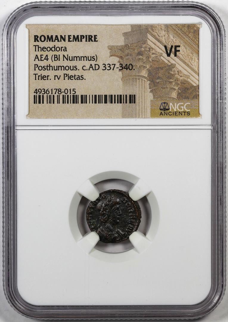 One Roman Empire 337-340 c.AD Theodora AE4 Bi Nummus Ancient Coin NGC VF. NGC Certified.
