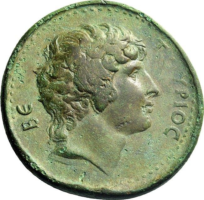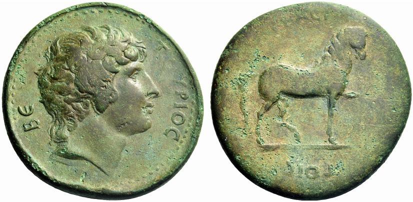 The Roman Empire. Antinous, favourite of Hadrian. Oktassarion or quinarius, Mantineia Arcadiae after 130, Æ 37.57g. BE–TOVPIOC Bare head r. Rev. TOIC [AP] KACI Pacing horse r., with l. foreleg raised. Blum 11. BCD Peloponnesus –. Extremely rare. A masterful portrait of fine style and a very attractive untouched light green patina, very fine / fine. Mantineia produced a variety of coins from the 5th through to the 2nd Century B.C. in the form of silver minors and small bronzes. However, during the age of Roman rule it was allowed to issue coins only on two occasions–under the emperor Hadrian in c. A.D. 134/5 to honour his deified companion Antinous, and early in the Severan period, c. A.D. 198-205. The connection between Mantineia and Antinous is described by Pausanius, the Greek travel writer who composed his work soon after the reign of Hadrian: “He has won worship in Mantineia for the following reason. Antinous was by birth from Bithynium beyond the river Sangarius, and the Bithynians are by descent Arcadians of Mantineia. For this reason [Hadrian] established his worship in Mantineia...” (Arcadia IX.7) Pausanius reports that in his day the newest temple in Mantineia was dedicated to Antinous: “...mystic rites are celebrated in his honour each year, and games every four years. There is a building in the gymnasium of Mantineia containing statues of Antinous, and it is remarkable for the stones with which it is adorned, and especially so for its pictures. Most of them are portraits of Antinous, who is made to look just like Dionysus.” (Arcadia IX.7-8) This entire series of coins was sponsored by a wealthy Greek named Veturius who, according to the inscription, “dedicated [this coinage] to the Arcadians”. His ego must have matched his wealth and social standing, for his name BETOYPIOC appears alone on the obverse, surrounding the portrait of Antinous (which in this case bears a strong resemblance to Alexander the Great). Even though the context of the issue would have been known to all, and the portraits of Antinous were distinctive enough to not require an inscription, it is still remarkable that the sponsor's name surrounds the portrait. It is a well-structured series consisting of five denominations. The largest (such as this) was an 8-assaria, with the smaller denominations being 4-assaria, 2-assaria, an assarion and a hemiassarion. Furthermore, the series includes both right- facing and left-facing issues for all denominations, creating what must have been a tempting series to collect for those who attended the festivities of c.134/5 (presumably the first in the sequence of quadrennial games described by Pausanius). Another feature of the series is the reverse type of a standing horse with a front leg raised. The type clearly relates to the worship of Poseidon, for Pausanius states that less than half a mile from Mantineia Hadrian had built a sanctuary and temple dedicated to the Horse Poseidon beside the ruins of the old sanctuary. He notes, also: “...there is, beside the walls of Mantineia, a place where horses race, and not far from it is a race-course, where they celebrate the games in honour of Antinous.” (Arcadia X) The worn state of the reverse and the appearance of the edge lead us to believe that this coin, like many other Antinous coins, was mounted and worn extensively. Otherwise, there would be no explanation for the disparity in wear between the obverse and reverse.