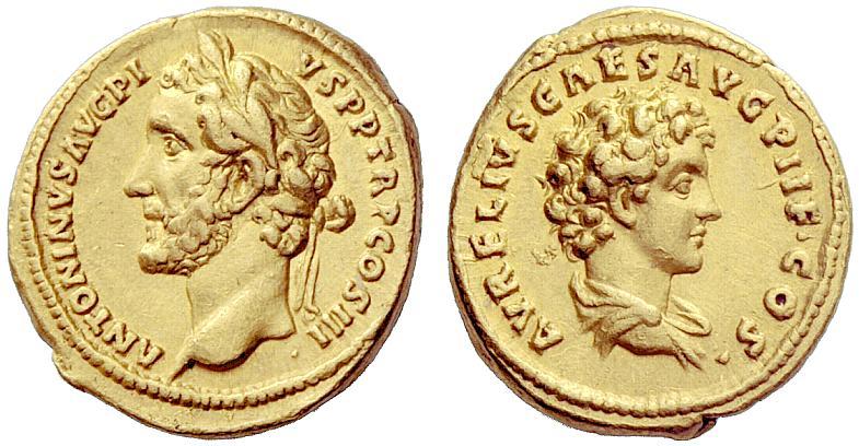 The Roman Empire. Antoninus Pius augustus, 138–161. Aureus 140, AV 7.23g. ANTONINVS AVG PI–VS P P TR P COS III Laureate head of Antoninus Pius l. Rev. AVRELIVS CAES AVG PII F COS Bare-headed and draped bust of Marcus Aurelius r. C 20 var. (CAESAR). BMC 170 note. RIC 421c (misdescribed). Calicó 1720b (these dies). Well centred on a full flan. Insignificant marks, otherwise about extremely fine. Ex NAC sale 51, 2009, 288.