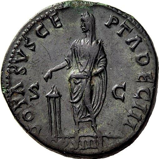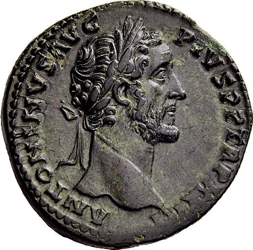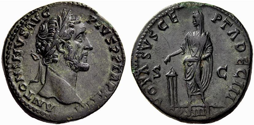 The Roman Empire. Antoninus Pius augustus, 138–161. Sestertius 158-159, Æ 21.16g. ANTONIVS AVG–PIVS P P TR P XXIII Laureate head r. Rev. VOTA SVSCE–PTA DEC III S–C A. Pius standing l., veiled and togate, sacrificing out of patera over tripod and holding roll in l. hand; in exergue, COS IIII. C 1024. BMC 2068. RIC 1010. Superb enamel like dark green patina and about extremely fine