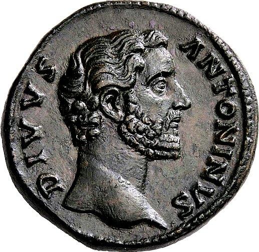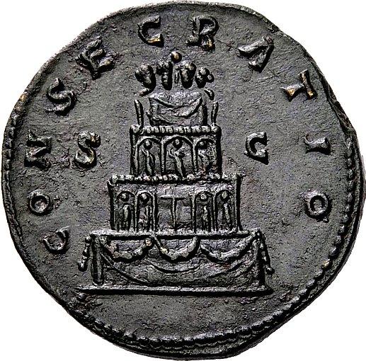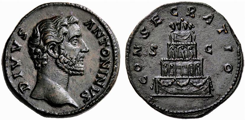 The Roman Empire. Antoninus Pius augustus, 138–161. Divus Antoninus. Sestertius after 161, Æ 22.57.g. DIVVS–ANTONINVS Bare head r. Rev. CONSECRATIO S–C Pyre of four tyres decorated with hangings and garlands and surmounted by facing quadriga. C 165. BMC 872. RIC 1266. Dark green patina and extremely fine. From the collection of Luc Girard.
