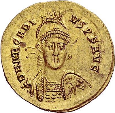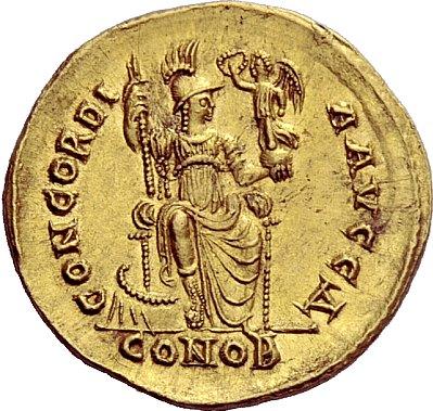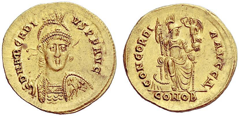 The Roman Empire. Arcadius, 383–408. Solidus, Constantinopolis 397-402, AV 4.44g. D N ARCADI–VS P F AVG Helmeted, pearl-diademed and cuirassed bust three-quarters facing, holding spear and shield decorated with horseman and enemy motif. Rev. CONCORDI–A AVGGD Constantinopolis, helmeted, seated facing, head r., holding sceptre and Victory on globe; r. foot on prow. In exergue, CONOB. RIC 7. Depeyrot 55/1. LRC 212. Extremely fine / good extremely fine
