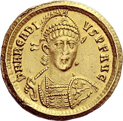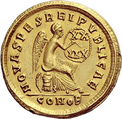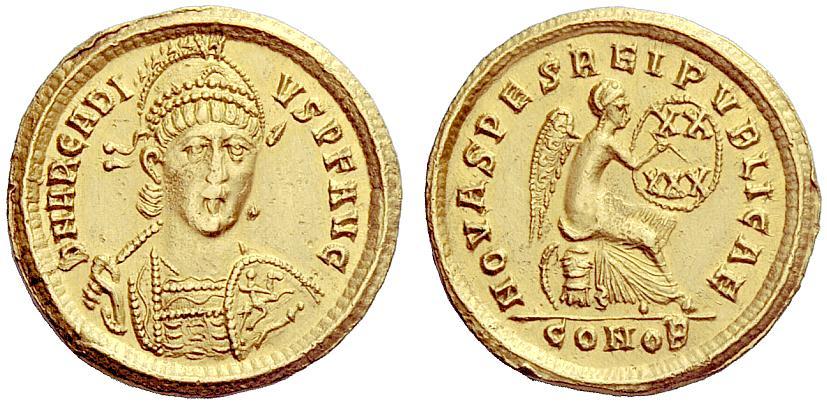 The Roman Empire. Arcadius, 383–408. Solidus, Constantinopolis 402-403, AV 4.47g. D N ARCADI–VS P F AVG Helmeted, pearl-diademed and cuirassed bust facing three-quarters r., holding spear and shield with horseman and enemy motif. Rev. NOVA SPES REIPVBLICAE Victory seated r. on shield and cuirass inscribing XX / XXX on shield resting on her l. knee. In exergue, CONOB. RIC 29. Depeyrot 54/2. LRC 250. About extremely fine