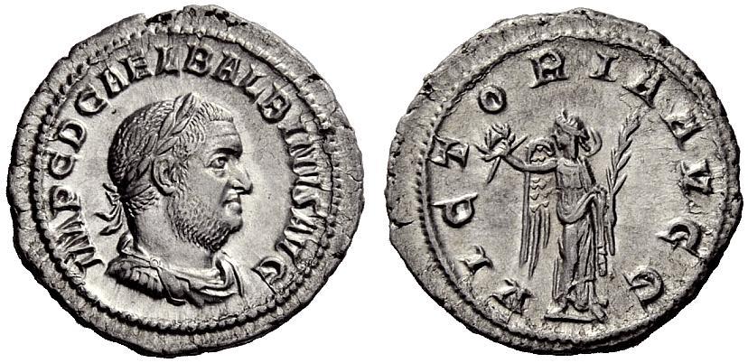 The Roman Empire. Balbinus, 22nd Apr-29th Jul 238. Denarius April-June 238, AR 3.29g. IMP C D C AEL BALBINVS AVG Laureate, draped and cuirassed bust r. Rev. VICTORIA AVGG Victory standing to front, head l., holding wreath and palm branch. C 27. BMC 37. RIC 8. Extremely fine