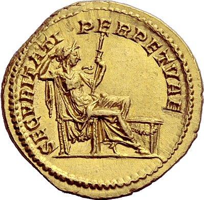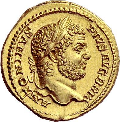 The Roman Empire. Caracalla augustus, 198–217. Aureus 210-213, AV 7.31g. ANTONINVS–PIVS AVG BRIT Laureate head r. Rev. SECVRITATI PERPETVAE Securitas seated r. by altar, propping head on r. hand and holding sceptre. C 575. BMC 101. RIC 229a. Calicó 2813. Rare. A marvellous bold portrait in the finest style of the period struck in high relief. Virtually as struck and almost Fdc. Ex NAC sale 27, 2004, 442.