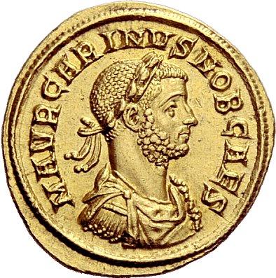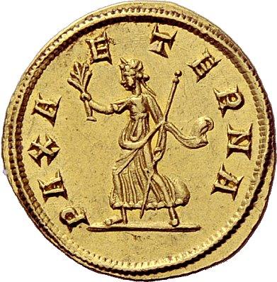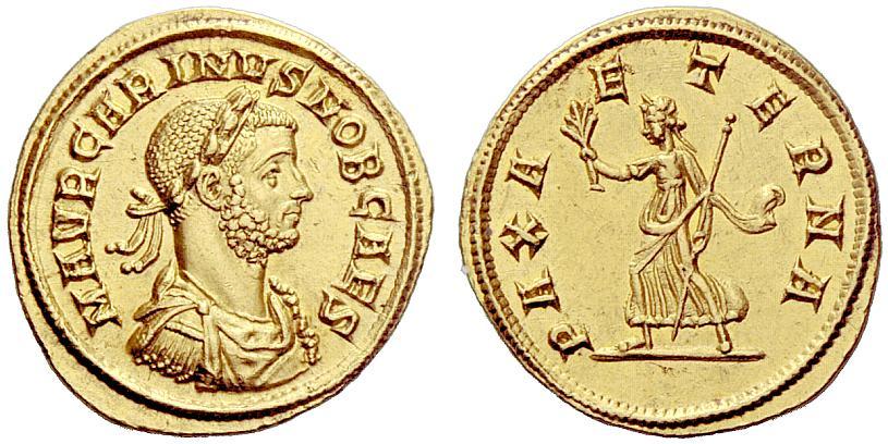 The Roman Empire. Carinus caesar, 282–283. Aureus 282, AV 4.83g. M AVR CARINVS NOB CAES Laureate, draped and cuirassed bust r. Rev. PAX A–ETERNA Pax walking l., holding olive branch and sceptre. C 62. RIC 153. Calicó 4351 (this obverse die). Very rare. Struck on a very large flan, lustrous and extremely fine. Ex Rollin & Feuardent, 25 April1887, Vicomte Ponton d’Amécourt 589; Sotheby’s 10 November 1972, Metropolitan part I, 208 and NAC 21, 2001, 549 sales.