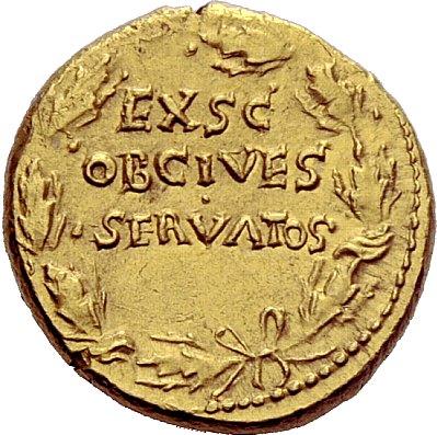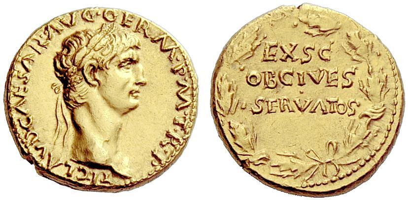 The Roman Empire. Claudius, 41-54. Aureus 41-42, AV 7.69g. TI CLAVD CAESAR AVG GERM P M TR P Laureate head r. Rev. E X S C / OB CIVES / SERVATOS within oak wreath. C 34. BMC 16. RIC 15. CBN 31. Calicó 356. A minor nick on brow, otherwise good extremely fine. Ex NAC sale 45, Barry Feirstein collection part IV, 2008, 86.