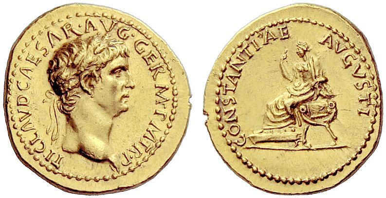 The Roman Empire. Claudius, 41-54. Aureus 41-42, AV 7.72g. TI CLAVD CAESAR AVG GERM P M TR P Laureate head r. Rev. CONSTANTIAE AVGVSTI Constantia seated l. on curule chair, raising r. hand; her feet on stool. C 5. BMC 11. RIC 13. CBN 27. Calicó 338. A bold portrait in the finest style of the period, perfectly struck on very large flan. Tiny test cut at three o’clock on obverse edge, otherwise virtually as struck and almost Fdc. Ex Spink sale 114, 1996, 87. By the time the emperor Claudius came to the throne after the murder of his depraved nephew Caligula, he been properly schooled in how terribly people can treat one another. Indeed, it was his enduring, impotent position in the eye of the Julio- Claudian storm that made him the central character in Robert Graves’ classic work of historical fiction, I, Claudius. As a child he could not benefit from his father, who died before he reached his first year, and he apparently suffered a lack of love from his mother, the otherwise admirable Antonia, who, according to Suetonius (Claudius 3) described him as “a monster: a man whom nature had not finished but had merely begun”. In the bigger picture, Claudius’ physical disabilities served him well, for he survived the treacherous reigns of Tiberius and Caligula (though not unscathed, for he suffered through the aftermath of many deplorable acts). His 13-year reign was entirely unexpected. In one of Tacitus’ most memorable and personal passages, he states about Claudius: “The more I think about history, ancient or modern, the more ironical all human affairs seem. In public opinion, expectation, and esteem no one appeared a less likely candidate for the throne than the man for whom destiny was secretly reserving it.” For most Romans, Claudius’ reign was a pleasant departure from the more oppressive reigns of Tiberius and Caligula, both of whom were generally disliked. Claudius seems to have been popular with the people and often with the army, but he usually was at odds with the senate, from whom he demanded hard work and dedication.
