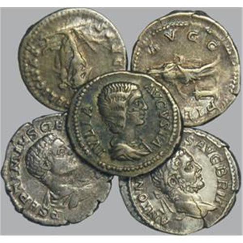 Lotti classici. Impero Romano. Impero Romano. Lotto di 5 denari da classificare. AG. Iulia Domna (3). Caracalla (1). Geta (1). BBBB+.