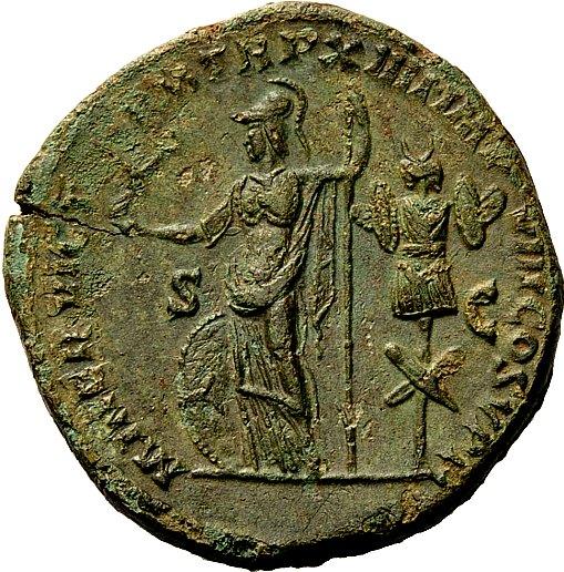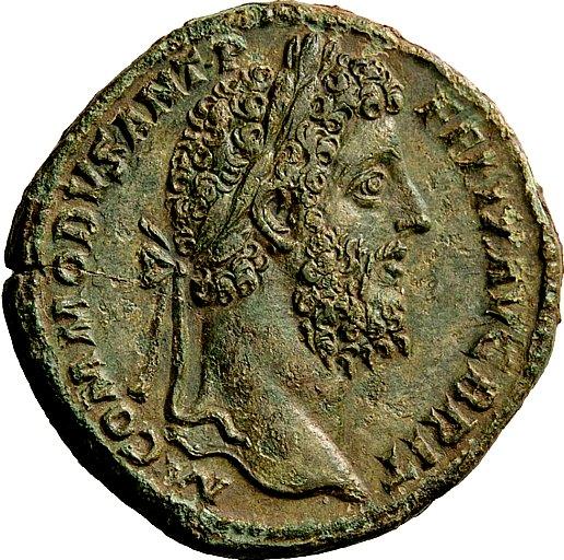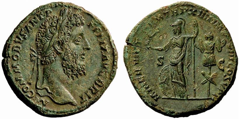 The Roman Empire. Commodus augustus, 177–192. Sestertius 188-189, Æ 23.33g. M COMMODVS ANT P–FELIX AVG BRIT Laureate head r. Rev. MINER VICT P M TR P XIIII IMP VIII COS V P P S–C Minerva standing l., holding Victory and spear; at her side, shield and behind, trophy. C 369. BMC 629. RIC 528. A magnificent and untouched light green patina, insignificant flan crack at nine o’clock on obverse, otherwise good extremely fine. Ex NAC sale 21, 2001, 489. From the Luc Girard collection.