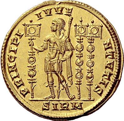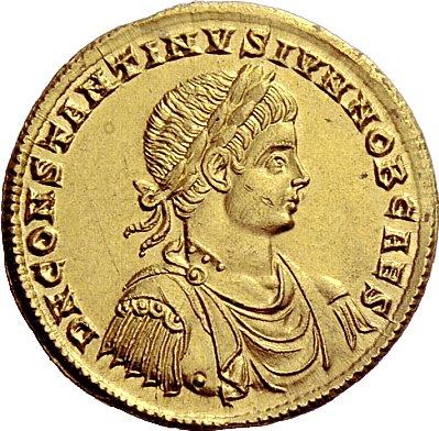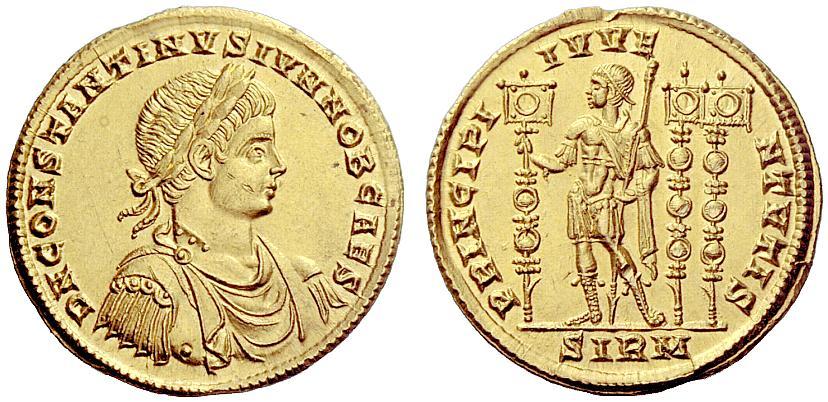 The Roman Empire. Constantine II caesar, 317–337. Medallion of 1½ solidi, Sirmium 320, AV 6.86g. DN CONSTANTINVS IVN NOB CAES Laureate, draped and cuirassed bust r. Rev. PRINCIPI–IVVE–NTVTIS Constantine II, in military attire, standing facing, head l., holding standard in r. hand and spear in l.; in field r., two standards. In exergue, SIRM. C –, cf. 153. Alföldi –. Gnecchi 9 (misdescribed) and pl. 9, 3. RIC 2. Depeyrot p. 153. Bastien, Donativa p. 76, footnote 11. Very rare. Light scratches on cheek and in obverse field, graze at twelve o’clock on reverse edge and nick on leg on reverse, otherwise brilliant extremely fine. Ex NAC 24, 2002, European Nobleman, 290 and NAC 31, 2005, 151 sales.