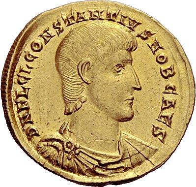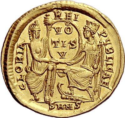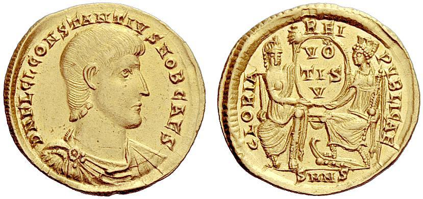 The Roman Empire. Constantius Gallus caesar, 351–354. Solidus, Nicomedia 351-354, AV 4.37g. D N FL CONSTANTIVS NOB CAES Bare-headed, draped and cuirassed bust r. Rev. GLORIA–REI–PVBLICAE Roma and Constantinopolis, enthroned facing, supporting between them a wreath inscribed VO / TIS / V. Roma holds spear in l. hand while Constantinopolis holds sceptre in l. hand and rests r. foot on prow. In exergue, SMNS. C 24. RIC 75. Depeyrot 5/3. Rare. Almost invisible marks on reverse, otherwise extremely fine. Ex NAC sale 51, 2009, 439.