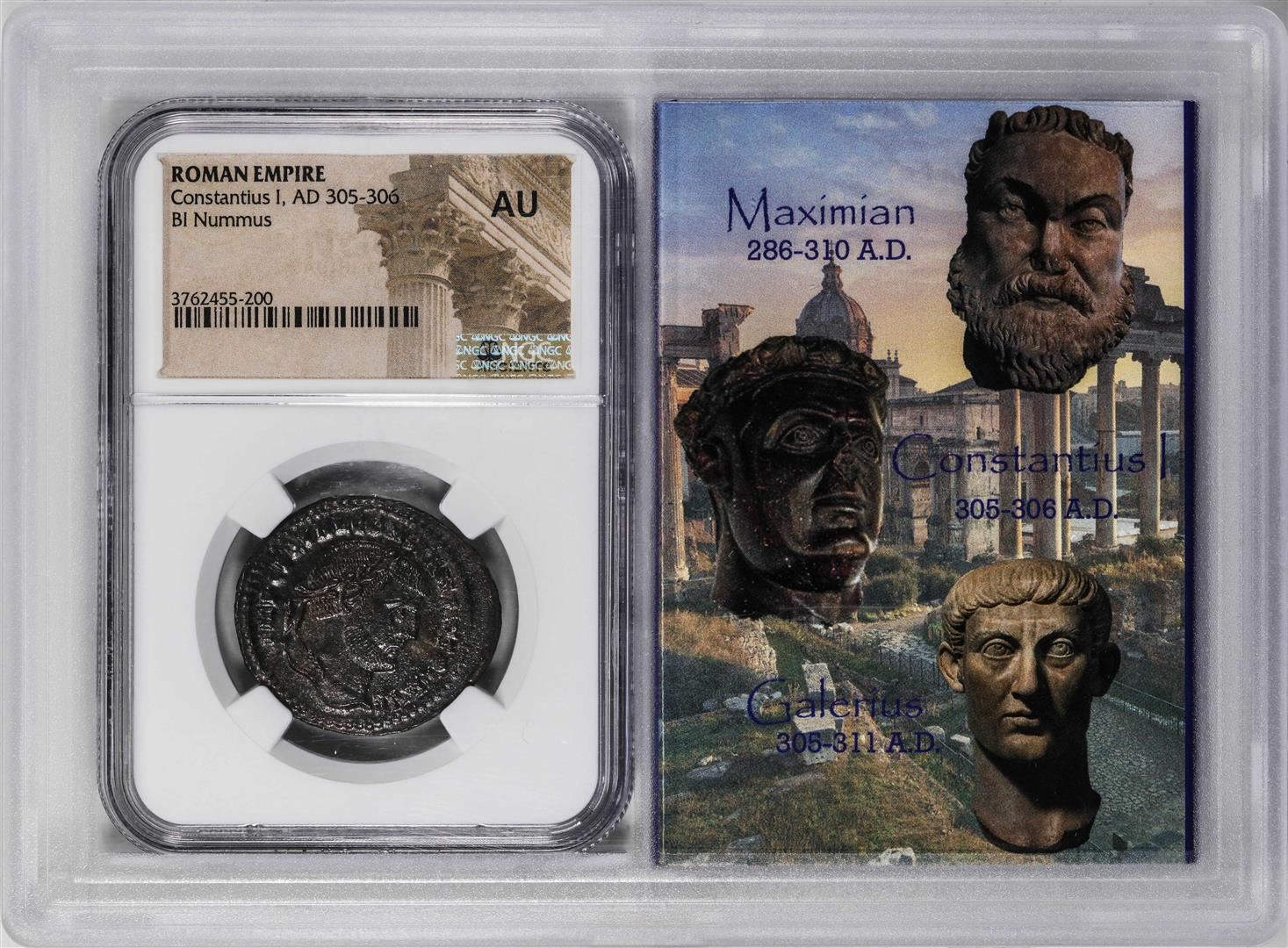 One Roman Empire Constantius I 305-306 AD BI Nummus Ancient Coin NGC Ch AU Story Box. NGC Certified.