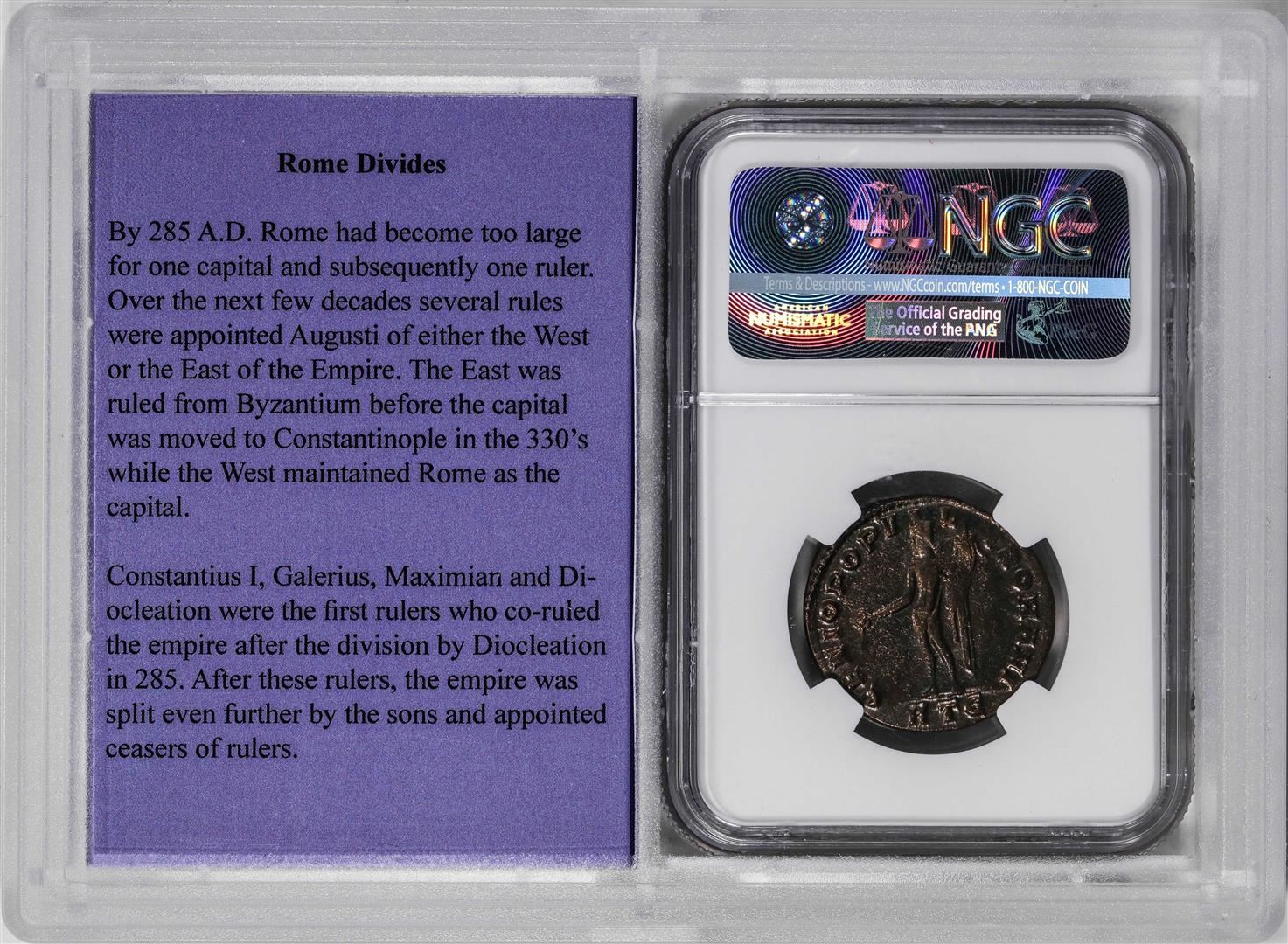 One Roman Empire Constantius I 305-306 AD BI Nummus Ancient Coin NGC Ch XF Story Box. NGC Certified.