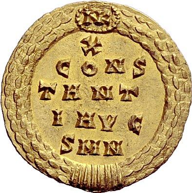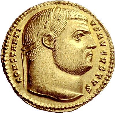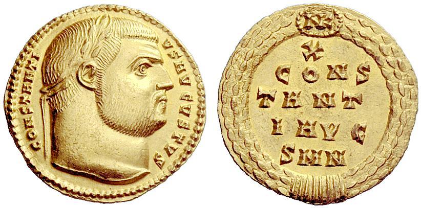 The Roman Empire. Constantius I augustus, 305–306. Aureus, Nicomedia 305-306, AV 5.32g. CONSTANTI–VS AVGVSTVS Laureate head r. Rev. X / CONS / TANT / I AVG / S M N within wreath closed at top by medallion inscribed NK ligate. C –. RIC 37. Depeyrot 9/5. Calicó 4888. Rare. Struck on a full flan and extremely fine. Ex NAC sale 11, 1998, 537.