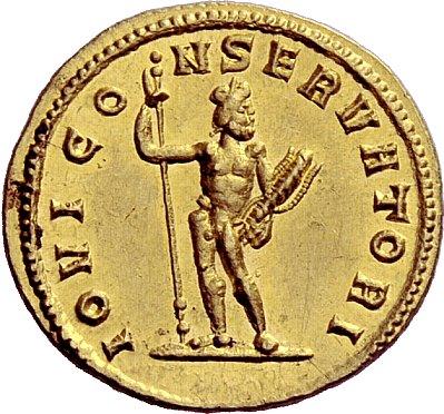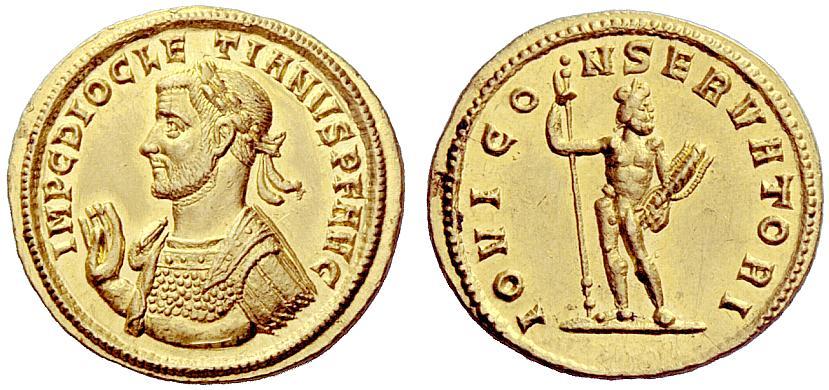 The Roman Empire. Diocletian, 284–305. Aureus, Siscia 286, AV 5.67g. IMP C DIOCLETIANVS P F AVG Laureate and cuirassed half bust l., with r. hand raised. Rev. IOVI CO–NSERVATORI Jupiter standing facing, head r., holding sceptre and thunderbolt. C –. RIC –, cf. 248. Depeyrot 1/5 (these dies). Kent-Hirmer pl. 151, 581 (these dies). Lukanc p. 229, 2. Calicó 4498 (this coin). Extremely rare, only very few specimens known. An interesting and unusual portrait, virtually as struck and almost Fdc. Ex Triton I, 1997, 1656 and NAC 41, 2007, 137 sales.