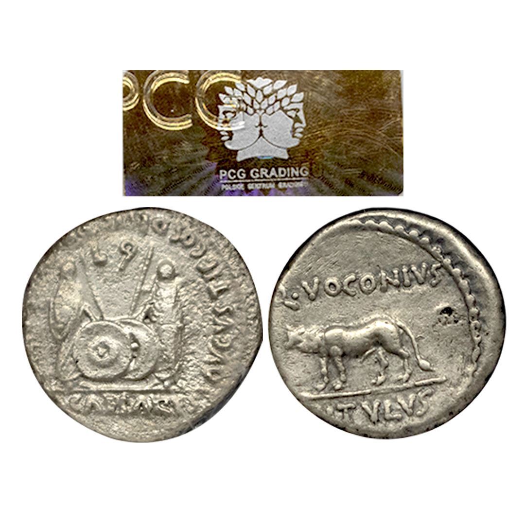 Roman Empire, Divus Julius Caesar (c. 49-44 BC), Silver Denarius, Rome Mint, OBV: Laureate head of Julius Caesar facing to right side with inscription DIVI.IVLI, REV: Bull-calf walking to left side with inscription Q.VOCONIVS above and VITVLVS below. Graded by PCG VF33.