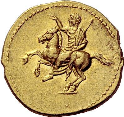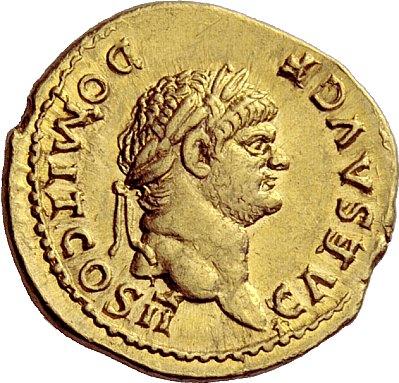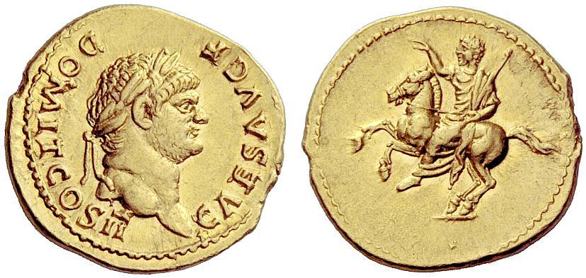 The Roman Empire. Domitian caesar, 69–81. Aureus 73-75, AV 7.25g. CAES AVG F DOMIT COS II Laureate head r. Rev. Domitian, draped, riding horse prancing l., holding sceptre in l. hand and raising r. C 663. BMC Vespasian 124. RIC Vespasian 679. CBN Vespasian 100. Calicó 811a. Virtually as struck and almost Fdc. Ex NAC 18, 2000, 486 and NAC 24, 2002, 57 sales.