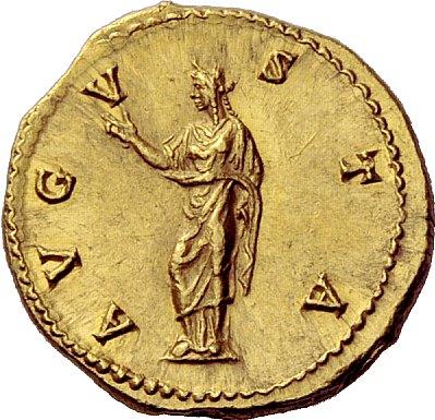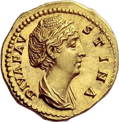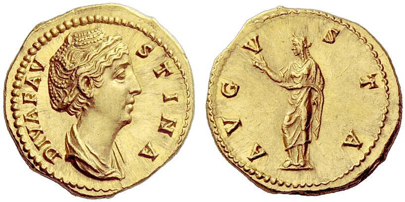 The Roman Empire. Faustina, wife of Antoninus Pius. Aureus after 141, AV 7.10g. DIVA FAV–STINA Draped bust r. Rev. AVG–V–STA Venus, diademed, standing l., raising r. hand and skirt. C 127. BMC p. 60 note ‡. RIC A. Pius 367. Calicó 1767. A handsome portrait struck in high relief. A perfect Fdc