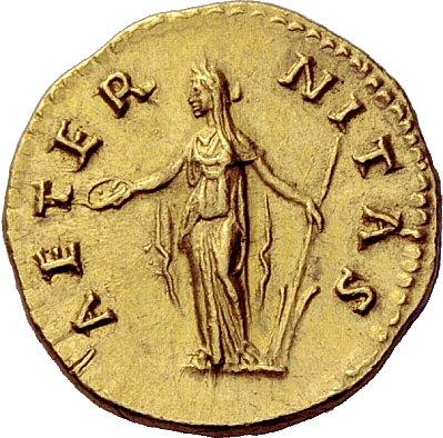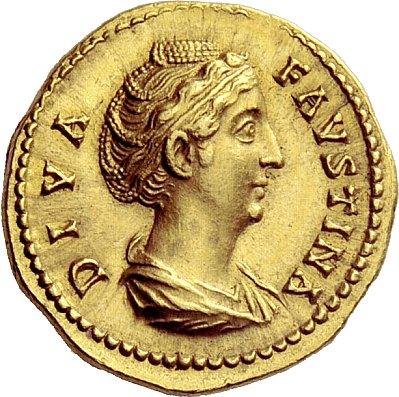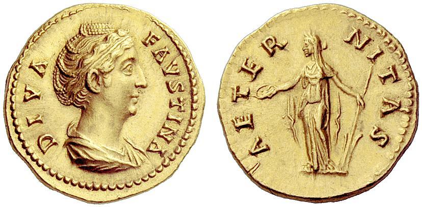 The Roman Empire. Faustina, wife of Antoninus Pius. Aureus after 141, AV 7.33g. DIVA–FAVSTINA Draped bust r. Rev. AETER–NITAS Fortuna standing l., holding patera in r. hand and rudder in l. C 2. BMC A. Pius 368. RIC A. Pius 349a. Calicó 1743. Extremely fine