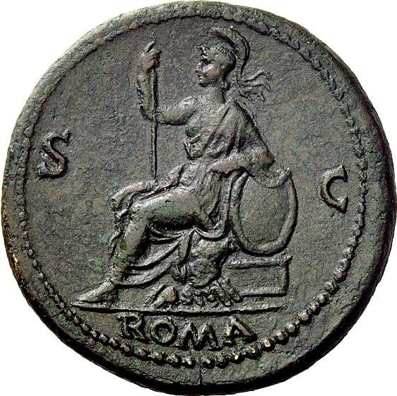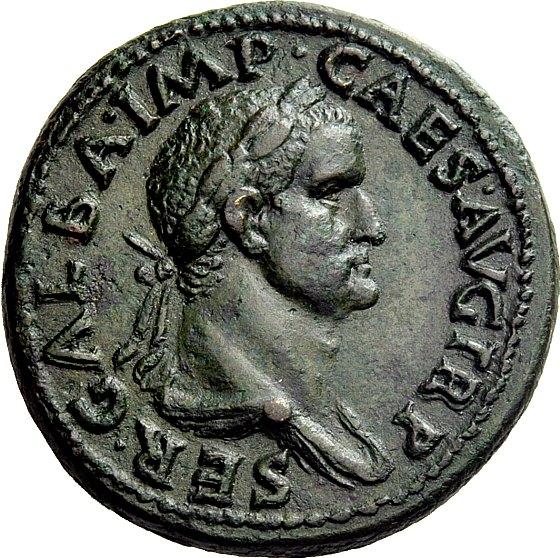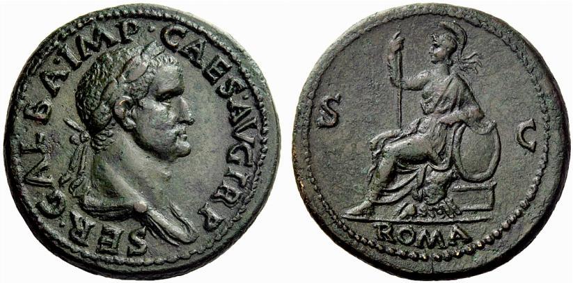 The Roman Empire. Galba, 68-69. Sestertius June-August 68, Æ 24.99g. SER GALBA IMP CAES AVG TR P Laureate and draped bust r. Rev. S–C Roma seated l. on cuirass, holding sceptre and resting l. elbow on shield set at her side; in exergue, ROMA. C 169. BMC 89. RIC 241. CBN 112. Rare. Struck on a broad flan with a pleasant green patina and extremely fine. Ex NGSA 4, 2006, 161 and NAC 52, October 2009, 358 sales.