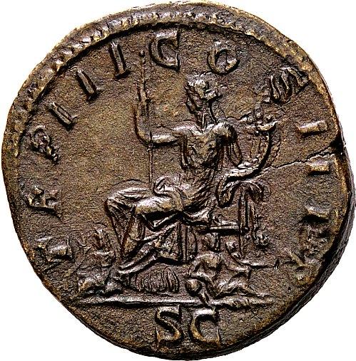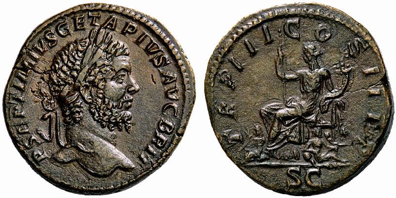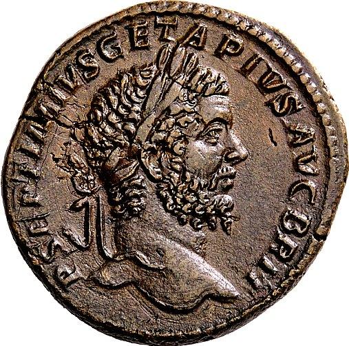 The Roman Empire. Geta augustus, 209–211. Sestertius 211, Æ 23.33g. P SEPTIMIVS GETA PIVS AVG BRIT Bearded and laureate head r. Rev. TR P COS III P P Female figure (Italia) seated l., holding sceptre and cornucopiae; on ground, to l., seated figure and, in front of chair, river-god reclining r.; in exergue, S C. C 199. BMC 45 (obverse) and 46 (reverse). RIC 171a. Very rare. A coin of great historical interest with a lovely light brown tone. Flan crack at ten crack on obverse, otherwise extremely fine. Ex NAC sale 6, 1993, 474. From the Luc Girard collection.