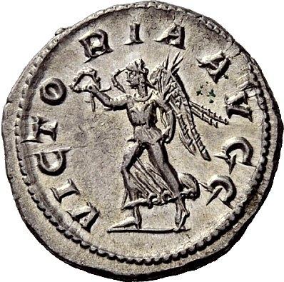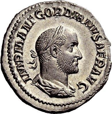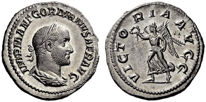 The Roman Empire. Gordian I, 1st-22nd April 238. Denarius April 238, AR 3.08g. IMP M ANT GORDIANVS AFR AVG Laureate, draped and cuirassed bust r. Rev. VICTORIA AVGG Victory advancing l., holding wreath and palm branch. C 12. BMC 28. RIC 2. Virtually as struck and almost Fdc