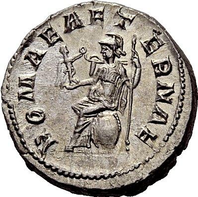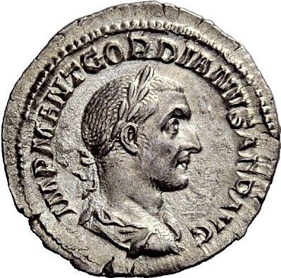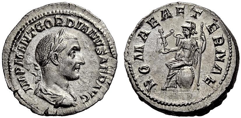 The Roman Empire. Gordian I, 1st-22nd April 238. Denarius April 238, AR 3.18g. IMP M ANT GORDIANVS AFR AVG Laureate, draped and cuirassed bust r. Rev. ROMAE AETERNAE Roma seated l. on shield, holding Victory and sceptre. C 8. BMC 8. RIC 4. Extremely fine