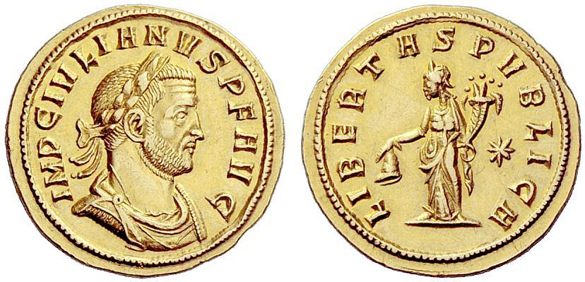 The Roman Empire. Julian I of Pannonia, October–December 284. Aureus, Siscia October-December 284, AV 4.64g. IMP C IVLIANVS P F AVG Laureate, draped and cuirassed bust r. Rev. LIBERTAS PVBLICA Libertas standing l., holding pileus in r. hand and cornucopia in l.; in r. field, large star. C 3. RIC 1d. Calicó 4413. Extremely rare. Almost invisible marks in field, otherwise extremely fine. Ex Leo Hamburger 19 October 1925, 1925 and Künker 124, 2007, 7659 sales. In 284 the Empire was in crisis: the ‘dynasty’ founded by Carus and his two sons in 282 had virtually collapsed, for not only had Carus died in 283 while campaigning against the Persians, but his youngest son, Numerian, who was leading the army back from the Persian front, died in the fall of 284. Remaining in power legitimately was the older brother, Carinus, who in the meantime had been ruling in the West. Following Numerian’s murder, another commander, Diocles (the future emperor Diocletian), was hailed emperor in his place, and in opposition to Carinus in the West. Caught between these to rivals was a third commander, Julian of Pannonia, who then was governing the province of Venetia and determined to stake his claim. While keeping a wary eye on the approach of Diocletian, Carinus quickly dealt with the nearer usurper, Julian, whom he defeated early in 285. All of Julian’s coins–billon aurelianiani and gold aurei (of which perhaps thirty are known)–were struck at Siscia, the only mint-city under his control.