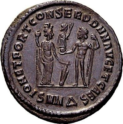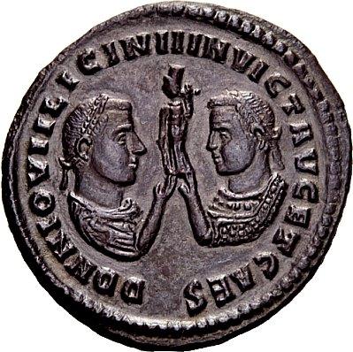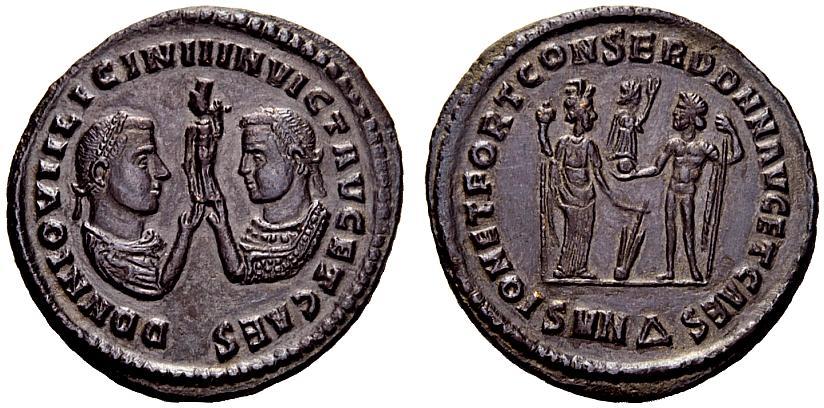 The Roman Empire. Licinius I augustus, 308–324. Follis, Nicomedia 320, Æ 3.68g. DD NN IOVII LICINII INVICT AVG ET CAES Confronted laureate busts of Licinius I and Licinius II, holding between them statuette of Fortuna, holding cornucopiae and rudder set on globe. Rev. I O M ET FORT CONSER DD NN AVG ET CAES Jupiter, naked but for chlamys, standing l., holding Victory and sceptre, in front, Fortuna, draped, standing l., holding cornucopiae and rudder set on globe; in exergue, SMND. C 1. RIC 38. Extremely rare and in exceptional condition. Dark tone gently smoothed, otherwise good extremely fine