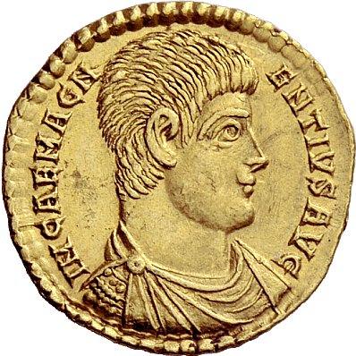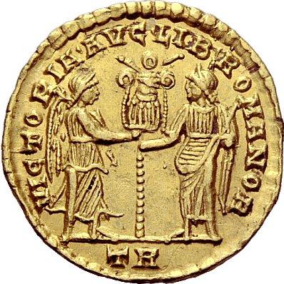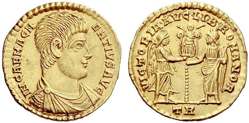 The Roman Empire. Magnentius, 350–353. Solidus, Treveri January-February 350, AV 4.32g. IM CAE MAGN–ENTIVS AVG Bare-headed, draped and cuirassed bust r. Rev. VICTORIA’ AVG’ LIB’ ROMANOR Victoria standing r. and Libertas standing l., supporting a trophy between them; the latter holds a sceptre in l. hand. In exergue, T R. C 46. RIC 247. Bastien, Magnence 5. Depeyrot 8/1. Very rare. Extremely fine. Ex Leu sale 48, 1989, 432.
