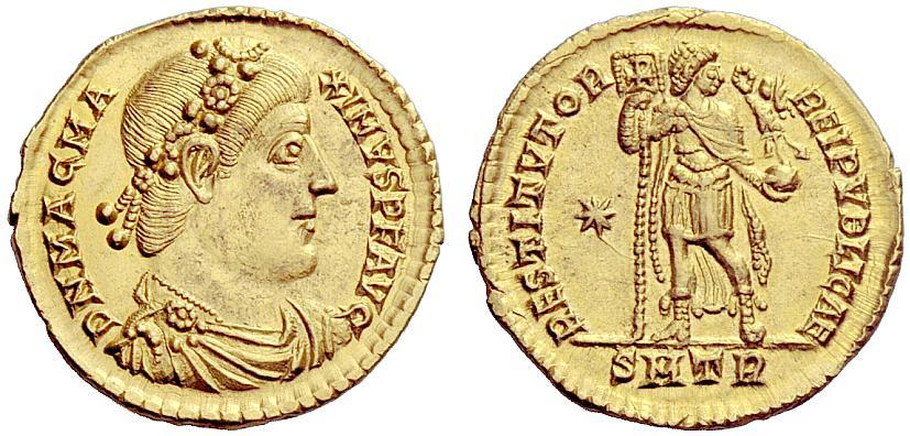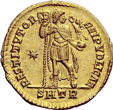 The Roman Empire. Magnus Maximus, 383–388. Solidus, Treveri 383-388, AV 4.45g. D N MAG MA–XIMVS P F AVG Rosette-diademed, draped and cuirassed bust r. Rev. RESTITVTOR–REI PVBLICAE Emperor standing facing, head r., holding labarum with Chrostogram and Victory on globe; in l. field, star. In exergue, SMTR. C 4. RIC 76. Depeyrot 50/1. Very rare and in exceptional condition for the issue. Good extremely fine. Ex Tkalec & Rauch sale 1987, 528.
