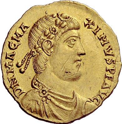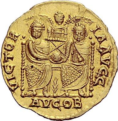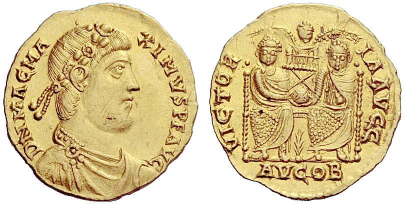 The Roman Empire. Magnus Maximus, 383–388. Solidus, Londinium-Augusta 387-388, AV 4.42g. D N MAG MA–XIMVS P F AVG Rosette-diademed, draped and cuirassed bust r. Rev. VICTOR–IA AVGG Two emperors seated on throne, holding globe between them; behind, Victory with outspread wings. Below, palm branch; in exergue, AVGOB. C 9. RIC 2b. Depeyrot 3/1. Very rare and an issue of great historical importance. Scratch on cheek, otherwise about extremely fine / extremely fine. This extremely rare issue has been ground of confrontation among scholars, in that the attribution of the coins bearing the mint-name AVG to Londinium Augusta is not universally accepted. The first one to advance this hypothesis was Sir Arthur Evans in NC 1915, but his ideas were considered unacceptable first by George Elmer, in NZ 1934, and then by Friedrich Mayreder, in NC 1947. They instead suggested Augustodunum, basing their argument on the assumption that coinage in precious metal, at the time, always implied the presence or immediate closeness of the Emperor, and that Maximus never visited Britain after 383. This attribution has not been accepted by Pearce in RIC vol. IX. As soon as Maximus raised to the rank of augustus in Britain, we might reasonably expect to find his earliest coinage coming from a British mint, which could have been only Londinium. Since it is evident the importance for Maximus to strike coins for propagandistic reasons and to pay donatives to the soldier, we do not understand why the work of the mint should have been stopped after this earlier issue. Our coin belongs to the second issue, which is extremely difficult to date. In it we find no trace of the previous policy of Maximus of dissociating himself from the coinage of Gratian, whose types and styles of mint mark (with OB and PS) are now carried over by him. It also quite interesting to notice the presence on the reverse of the legend VICTORIA AVGG; in fact it is quite difficult to establish who is the second Augustus implied in the legend. It is most probably Theodiusius and and this means that the “Senior Augustus” Valentinian II is ignored. Is there implicit in the matter a claim of Maximus to the whole Valentinian I 's inheritance ? Arthur Evans in NC 1915, but his ideas were considered unacceptable first by George Elmer, in NZ 1934, and then by Friedrich Mayreder, in NC 1947. They instead suggested Augustodunum, basing their argument on the assumption that coinage in precious metal, at the time, always implied the presence or immediate closeness of the Emperor, and that Maximus never visited Britain after 383. This attribution has not been accepted by Pearce in RIC vol. IX. As soon as Maximus raised to the rank of augustus in Britain, we might reasonably expect to find his earliest coinage coming from a British mint, which could have been only Londinium. Since it is evident the importance for Maximus to strike coins for propagandistic reasons and to pay donatives to the soldier, we do not understand why the work of the mint should have been stopped after this earlier issue. Our coin belongs to the second issue, which is extremely difficult to date. In it we find no trace of the previous policy of Maximus of dissociating himself from the coinage of Gratian, whose types and styles of mint mark (with OB and PS) are now carried over by him. It also quite interesting to notice the presence on the reverse of the legend VICTORIA AVGG; in fact it is quite difficult to establish who is the second Augustus implied in the legend. It is most probably Theodiusius and and this means that the “Senior Augustus” Valentinian II is ignored. Is there implicit in the matter a claim of Maximus to the whole Valentinian I 's inheritance ?