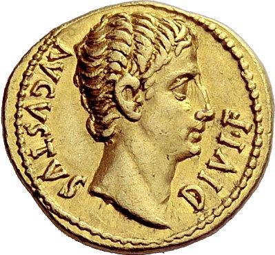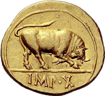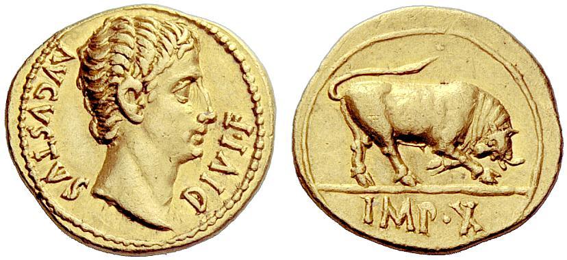The Roman Empire. Octavian as Augustus, 27 BC–14 AD. Aureus, Lugdunum 15-13 BC, AV 7.89g. AVGVSTVS–DIVI F Bare head r. Rev. Bull butting r.; in exergue, IMP X. C 136. Bahrfeldt 201. BMC 450. RIC 166a. CBN 1372. Calicó 212. Struck on a full flan, minor marks, otherwise extremely fine. Ex NAC sale 23, 2002, 1463.