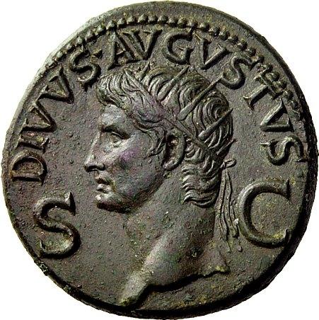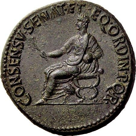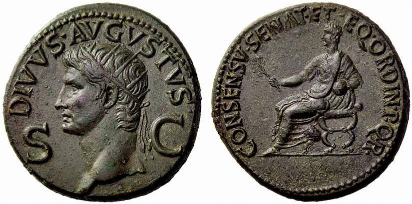 The Roman Empire. Octavian as Augustus, 27 BC–14 AD. Divus Augustus. Dupondius ca. 37-41, Æ 15.40g. DIVVS·AVGVTSVS S–C Radiate head l. Rev. CONSENSV·SENAT·ET·EQ·ORDIN·P·Q·R· Augustus seated l. on curule chair, holding branch in r. hand and globe (?) in l. C 87. BMC Gaius 88. RIC Gaius 56. CBN Gaius 134. Green patina and extremely fine