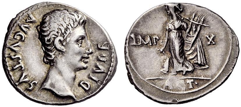 The Roman Empire. Octavian as Augustus, 27 BC–14 AD. Denarius, Lugdunum 11-10 BC, AR 3.93g. AVGVSTVS–DIVI·F Bare head r. Rev. IMP–X Apollo Citharoedus standing l., holding plectrum and lyre; in exergue, ACT. C 144. BMC 461. RIC 171a. CBN 1396. Lovely iridescent tone and about extremely fine. Ex NAC sale 21, 2001, 358.