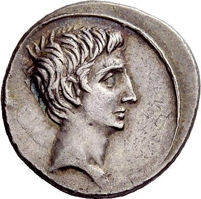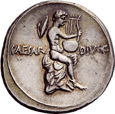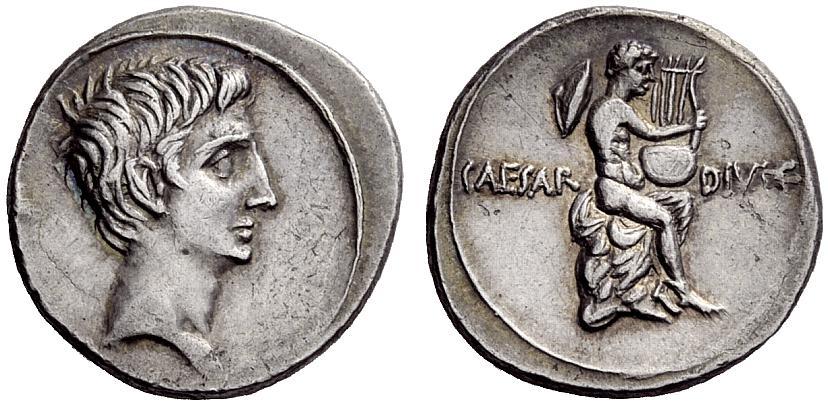 The Roman Empire. Octavian, 32–27 BC. Denarius, Brundisium or Roma 32-29 BC, AR 3.87g. Bare head r. Rev. CAESAR–DIVI F Naked male figure, with petasus slung behind, seated r. on cloak on rock, playing lyre. C 61. BMC 597. RIC 257. CBN 75. Lightly toned and extremely fine. Ex NAC sale 21, 2001, 336.