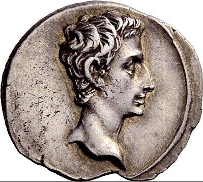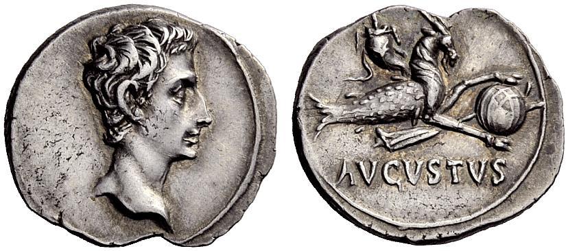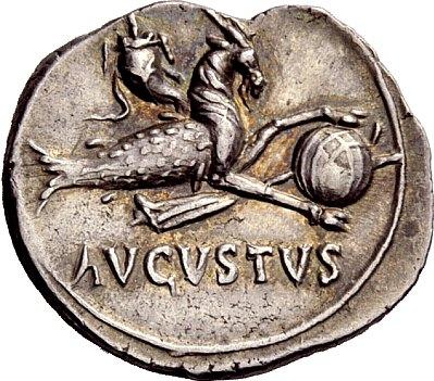 The Roman Empire. Octavian as Augustus, 27 BC–14 AD. Denarius, Colonia Patricia ca. 18-16 BC, AR 3.77g. Bare head r. Rev. Capricorn r. with cornucopiae set on its back, holding globe and rudder. C 21. BMC 346. RIC 126. CBN 1266. Lightly toned and extremely fine. Ex NAC sale 21, 2001, 357.