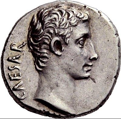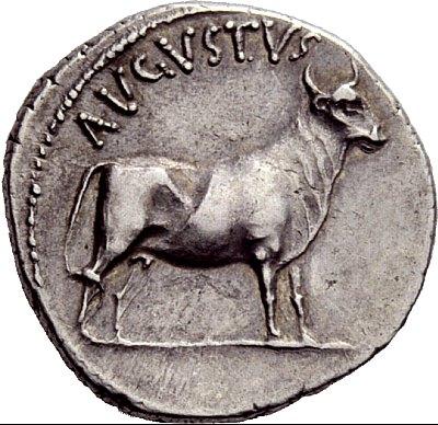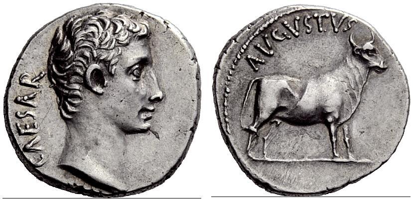 The Roman Empire. Octavian as Augustus, 27 BC–14 AD. Denarius, Samos (?) ca. 21-20 BC, AR 3.72g. CAESAR Bare head r. Rev. AVGVSTVS Bull standing r. C 28. BMC 663. RIC 475. CBN 941. Pleasant portrait, an insignificant metal flaw below chin, otherwise extremely fine