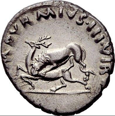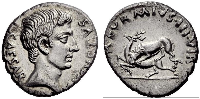 The Roman Empire. Octavian as Augustus, 27 BC–14 AD. M. Durmius. Denarius ca. 19 BC, AR 3.82g. CAESAR–AVGVSTVS Bare head r. Rev. M DVRMIVS III VIR Lion l. attacking stag. C 431. BMC 63. RIC 318. CBN 213. Extremely fine