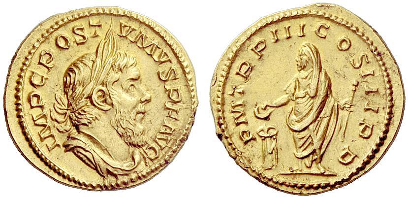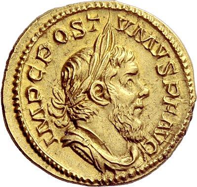 The Roman Empire. Postumus, 260–269. Aureus, Lugdunum 261, AV 6.40g. IMP C POST–VMVS P F AVG Laureate, draped and cuirassed bust r. Rev. P M TR P III COS III P P Postumus, veiled and togate, standing l., holding sceptre and sacrificing out of patera over altar. C 270 var. (not cuirassed). RIC 4. Schulte 39b (this coin). Jameson 267 (this coin). Calicó 3758 (this coin). Biaggi 1525 (this coin). Extremely rare. An exquisite portrait in the finest style of the period, almost invisible marks, otherwise extremely fine. Ex Rollin & Feuardent sale 26-27 May 1909, Evans, 258. From the Biaggi and Jameson collections. In the chaos that enveloped the West during the mid- and later 3rd Century, resourceful generals were valued for their ability to spare their fellow Romans the horror of invasion, and were feared for their ability to inspire their legions–purposely or inadvertently–to rebellion. Such was the case in Germany and Gaul in the fall of 260, when a commander named Marcus Cassianius Latinius Postumus assumed the purple some months after news was received of the capture of Valerian I by the Sasanians. The position held by Postumus is not clear. He may have been a commander or a governor of one of the Germanies. The Historia Augusta describes him as Transrhenani limitis dux et Galliae praeses and Aurelius Victor as barbaris per Galliam praesidebat. The claim in the Historia Augusta that he came to power with the assistance of his eponymous father is considered by most to be an invention typical of that source. This aureus seems to have been struck in the first quarter of 262, by which time Postumus had been in power for well more than a year. The reverse records that he was celebrating the third renewal of his tribunician power and had entered his third consulship, presumably awarded on January 1, 262. Schulte's die study of Gallo-Roman gold reveals a complex and well-conceived series of issues under Postumus, spanning from the start of his revolt to at least early 269. Within nine of the 12 issues identified by Schulte there is significant die- linking, which may suggest each was produced in comparatively narrow time frames. The largest emissions seem to have occured from the fall of 263 through the start of 264, and in the beginning of 268.