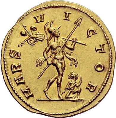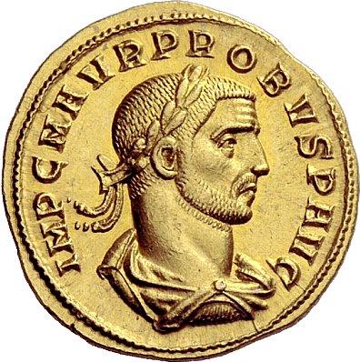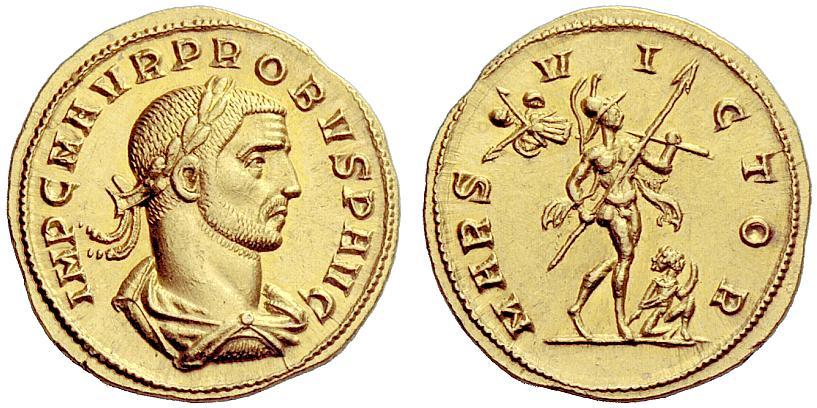 The Roman Empire. Probus, 276–282. Aureus, Siscia 276-282, AV 6.72g. IMP C M AVR PROBVS P AVG Laureate, draped and cuirassed bust r. Rev. MARS–VI–CTOR Mars advancing r., holding spear and trophy; captive sat at his feet. C 331 var. (PROBVS AVG). RIC –. Calicó 4164 (this coin). An apparently unique variety. A bold portrait, virtually as struck and almost Fdc. Ex Triton sale III, 1999, 1169.