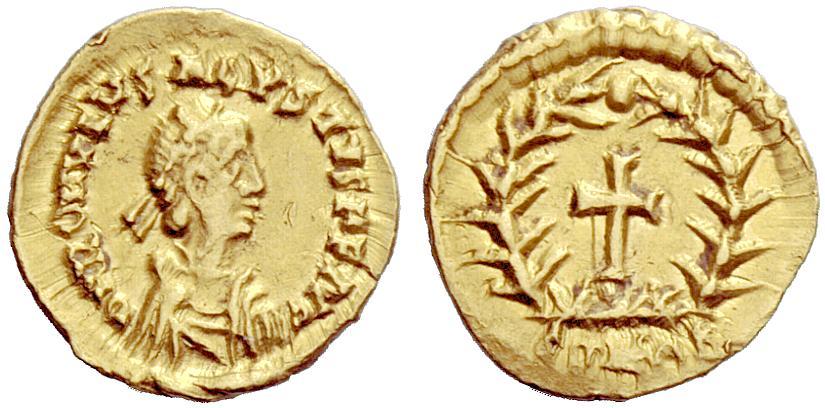 The Roman Empire. Romulus Augustus, 31st October 475–4th September 476. Tremissis 31st October 475-4th September 476, AV 1.42g. D N ROMVLS AVGVSTVS P F AVG Pearl- diademed, draped and cuirassed bust r. Rev. Cross within wreath; below, COMOB. C 10. RIC 3419. Depeyrot 43/2. LRC 950. Lacam 37 (these dies). Extremely rare. An almost invisible mark on obverse field, otherwise about extremely fine / extremely fine. The last legitimate ruler of the Western Roman Empire was Julius Nepos, who remained the constitutional emperor in absentia from his base in Dalmatia. However, traditionally that honor has been incorrectly given to Romulus Augustus (sometimes surnamed Augustulus, "the little emperor"), who, after Nepos fled Italy, was hailed emperor as a figurehead of his fathers army. His reign lasted just ten months before Germans under Odovacar withdrew their support and deposed both the young emperor and his father. The Germans allowed the former boy-emperor live, and provided him with an ample pension so he could engage in an early retirement to an estate on the Gulf of Naples in Campania, where he is said to have lived for at least thirty more years.