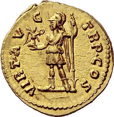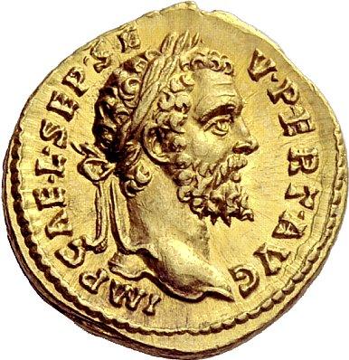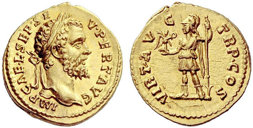 The Roman Empire. Septimius Severus, 193–211. Aureus 193, AV 7.18g. IMP CAE L SE–V PERT AVG Laureate head r. Rev. VIRT AVG–TR P COS Virtus standing to front, head l., holding Victory and reverted spear. C 751. BMC 32. RIC 24. Calicó 2570. An exceptional portrait struck in very high relief, a perfect Fdc