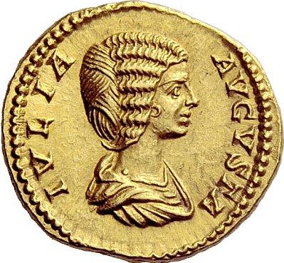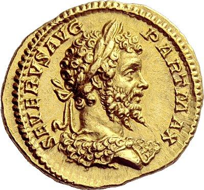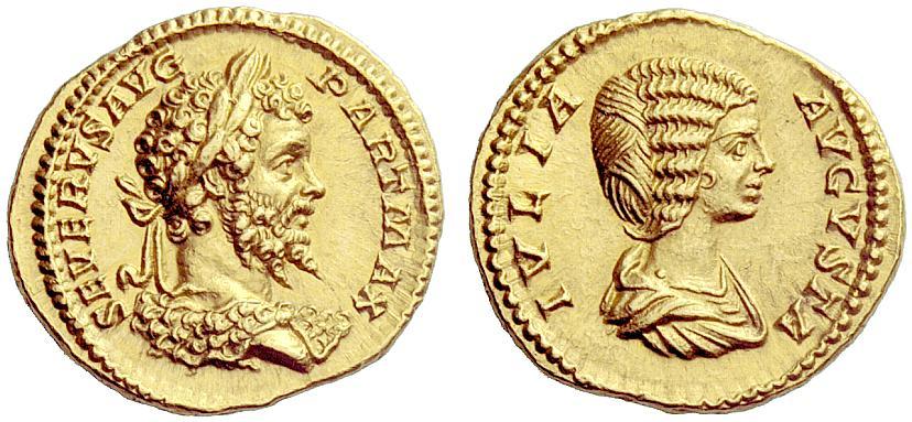 The Roman Empire. Septimius Severus, 193–211. Aureus 201, AV 7.27g. SEVERVS AVG–PART MAX Laureate bust r., lion’s skin over shoulders. Rev. IVLIA–AVGVSTA Draped bust r. C 1. BMC 192. RIC 161b. Calicó 2587 (this obverse die). Very rare. Two magnificent portraits of excellent style. Virtually as struck and almost Fdc. Ex Leu 50, 1990, 332; CNG 38, 1996, 1040; Triton I, 1997, 1531and NAC 24, 2002, European Nobleman, 131 sales. Beginning in 201 and extending through the following year there was a tremendous emission of coinage bearing dynastic types. After so many years of civil war and social turmoil, Septimius Severus thought it prudent to publicise the dynasty he had founded, and the stability that it represented to the Roman people. The portrait of Septimius Severus on this coin is particularly interesting as the style of the hair and beard derives from the iconography of the Alexandrian god Serapis. This is meant to illustrate Severus’ identification with this African god, as he himself was a Roman of African extraction. The reverse bears a portrait of his wife, Julia Domna, who was of Syrian origin.