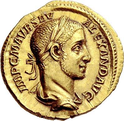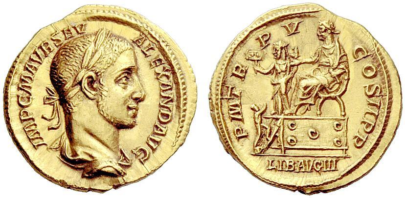 The Roman Empire. Severus Alexander, 222–235. Aureus 226, AV 6.45g. IMP C M AVR SEV–ALEXAND AVG Laureate and draped bust r. Rev. P M TR–P V–COS II P P Severus seated l. on curule chair on platform, extending r. hand; at his side r., Liberalitas standing l., holding cornucopia and abacus. Before the Emperor, citizen raising his hands; in exergue, LIB AVG III. C –. BMC –. RIC –. Calicó 3110 (this coin). Of the highest rarity, apparently only two specimens known. Struck in high relief and good extremely fine. Ex Triton II, 1998, 975 and NAC 24, 2002, European Nobleman,162 sales. As successor to his cousin Elagabalus, whose fanatical behaviuor made him unpopular in virtually all social circles, Severus Alexander represented a return to normalcy–or at least as close as was possible. He was hailed Caesar in the middle of 221 as a counterbalance to Elagabalus, and early in the next year he replaced his cousin as emperor, for Elagabalus made the fatal error of forcing the praetorian guardsmen to choose between them. Both had been about 14 years old when they ascended the throne, but Alexander proved more willing to take the advice of his family elders: his mother Julia Mamaea and his grandmother Julia Maesa. Docile by nature, Alexander showed little desire for independent action, and the careful maternal tutelage he received no doubt contributed to his reign lasting thirteen years. When this important aureus was struck, Alexander was 17 or 18 years old, and already had reigned longer than his unfortunate cousin. Alexander is shown distributing coins to a diminutive figure who climbs a ladder at the front of the platform upon which Liberalitas stands beside the emperor, who sits on a curule chair. The rectangular object held by Liberalitas is traditionally described as a counting device (an abacus), but it might be a coin counter in the form of a flat board with shallow, coin- size depressions matching the appropriate number of coins required for distribution. Such a device no doubt would have added greatly to the efficiency and the accuracy of such distributions.