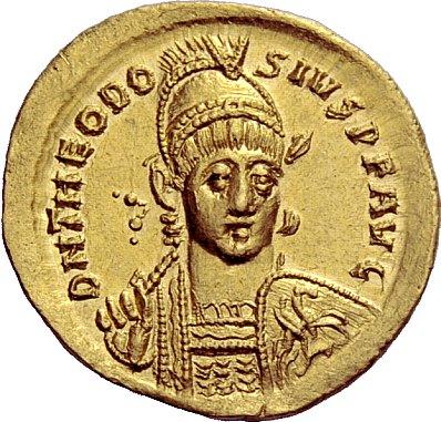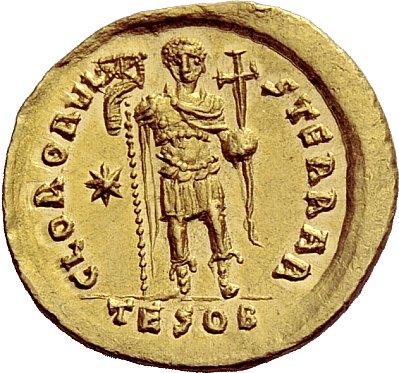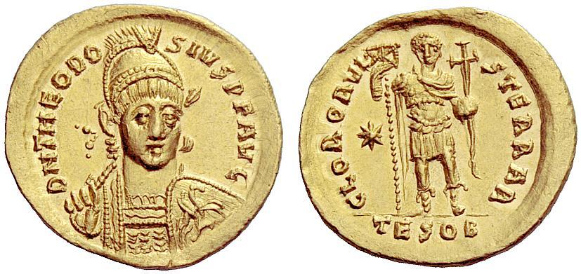The Roman Empire. Theodosius II, 402–450. Solidus, Thessalonica 424-425, AV 4.43g. D N THEODO–SIVS P F AVG Helmeted, pearl-diademed and cuirassed bust facing three-quarters r., holding spear and shield decorated with horseman-enemy motif. Rev. GLOR ORVI–S TERRAR Emperor standing facing, holding labarum in r. hand and globe surmounted by cross in l.; in l. field, star. In exergue, TESOB. RIC 363. Depeyrot 51/1. LRC 366. Virtually as struck and almost Fdc