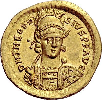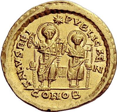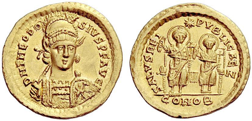 The Roman Empire. Theodosius II, 402–450. Solidus, Constantinopolis 425–429, AV 4.32g. D N THEODO–SIVS P F AVG Helmeted, pearl-diademed and cuirassed bust facing three-quarters r., holding spear and shield with horseman and enemy motif. Rev. SALVS REI–PVBLICAE Z Two emperors, nimbate, enthroned facing, both in consular robes, holding mappa and cruciform sceptre; above them a star. In exergue, CONOB. RIC 237. Depeyrot 79/1. MIRB 23b. LRC 376 (offica S). Virtually as struck and almost Fdc
