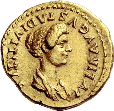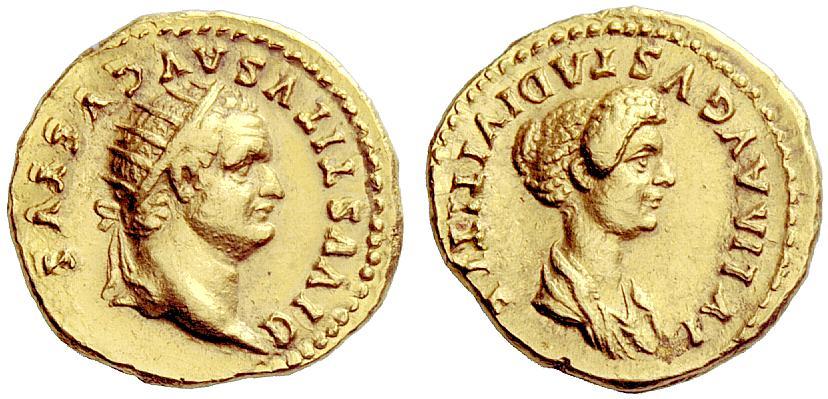 The Roman Empire. Titus augustus, 79–81. Divus Titus. Aureus 82-83, AV 7.49g. DIVVS TITVS AVGVSTVS Radiate head r. Rev. IVLIA AVGVSTA DIVI TITI F Draped bust of Julia r. C 1. BMC Domitian 69. RIC Domitian 147. CBN Domitian 74. Calicó 805. Extremely rare. Two very attractive portraits of fine style. Slightly bent, several edge nicks, possibly traces of mounting, otherwise about extremely fine. Ex Sotheby’s sale 9 June 1983, Virgil M. Brand part III, 291. When the emperor Titus died in September, A.D. 81, Domitian could not have been displeased: he had lived in the shadow of his more fortunate, older brother his entire life, and with Titus' passing he was raised from the rank of Caesar to Augustus, and with that took command of the Roman world. The sources record that Domitian was not merely satisfied with his brother's demise, but made no effort to prevent it; at least three later sources suggest that he murdered Titus. Sibling rivalry and murder plots aside, the practical nature of Domitian assured that he saw the personal value of having his brother deified, and for commemorating him with monuments and coins such as this aureus. Domitian knew that he was emperor almost exclusively because of his family ties, as his rule represented the continuation of the Flavian dynasty. This aureus belongs to a series that Domitian issued in A.D. 82/3, not long after he had assumed the purple. It contains aurei and denarii devoted individually to members of the family, and also dual-portrait issues for Vespasian, Titus and Domitian, as well as Domitilla (Domitian's sister), Domitia (Domitian's wife) and Julia Titi (Domitian's niece). The series is supplemented with aes in the name of Titus and Domitia. After these groups were produced, Domitian does not appear to have struck imperial coins for a family member for at least the next seven years. This is perhaps the most curious of his dual-portrait issues, for on the obverse appears the brother who Domitian disliked (and may have murdered), and on the reverse appears his brother's daughter, with whom Domitian was infatuated. When both were younger there had been an attempt to arrange a marriage between Domitian and Julia Titi, but the former was already married to Domitia, so his niece married a second-cousin, Flavius Sabinus. The fact that they were married did not prevent them from having an amorous, incestuous relationship, which we are told started before Titus died. When it was convenient, Domitian even had Julia's husband executed. Dio Cassius (67.3.2) describes the domestic situation after Domitian divorced his wife Domitia in c.83: “After this he lived with his own niece (Julia, that is to say) as husband with wife, making little effort at concealment. Then upon the demands of the people he became reconciled with Domitia, but continued his relations with Julia none the less.” The most shocking reports, however, concern the death of Julia in c.90/1, which we are told resulted from a failed abortion forced upon her by Domitian.