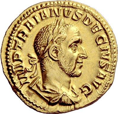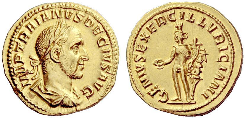 The Roman Empire. Trajan Decius, 249–251. Aureus 249-251, AV 4.39g. IMP TRAIANVS DECIVS AVG Laureate, draped and cuirassed bust r. Rev. GENIVS EXERC ILLVRICIANI Genius, wearing polos, standing l., holding patera and cornucopiae; to r., standard. C 48 var. (not draped). RIC 3. Calicó 3291 (this coin). Biaggi 1394 (this coin). Minor marks, otherwise extremely fine. From the Biaggi collection.